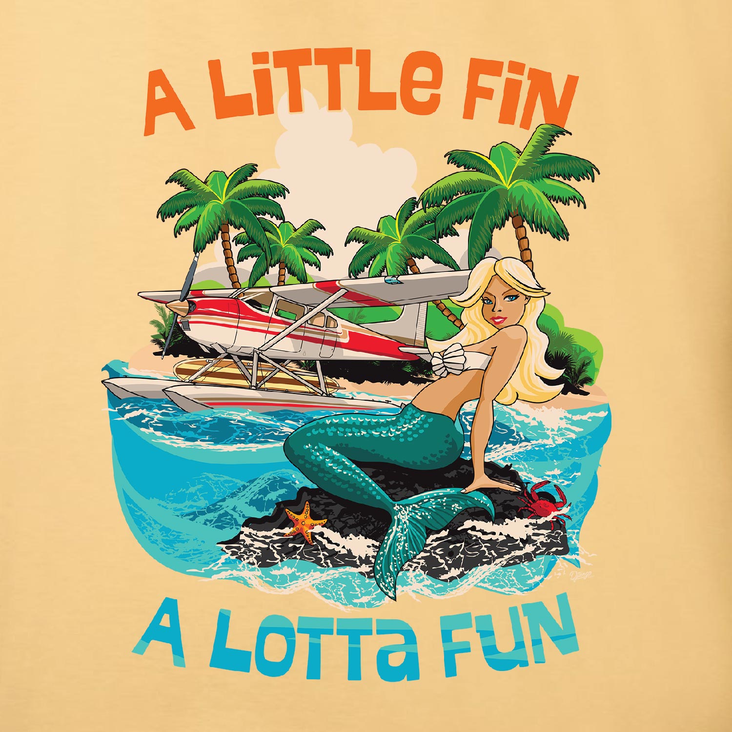 Fun seaplane mermaid surf shirt, “A Little Fin – A Lotta Fun – Mermaids Seaplane & Surf Service”