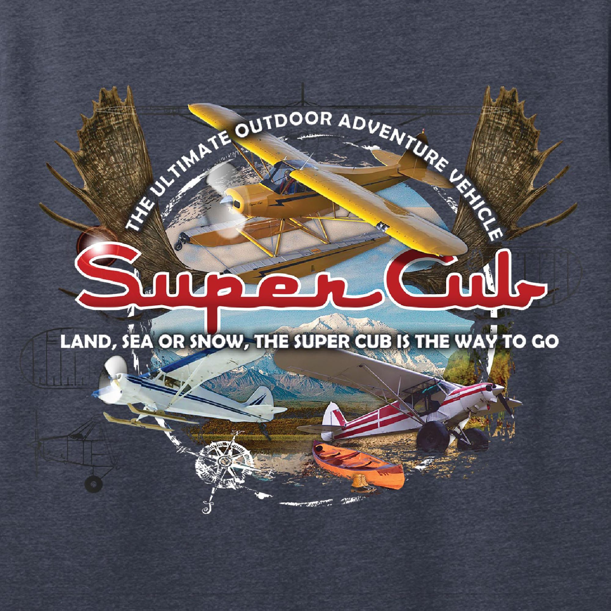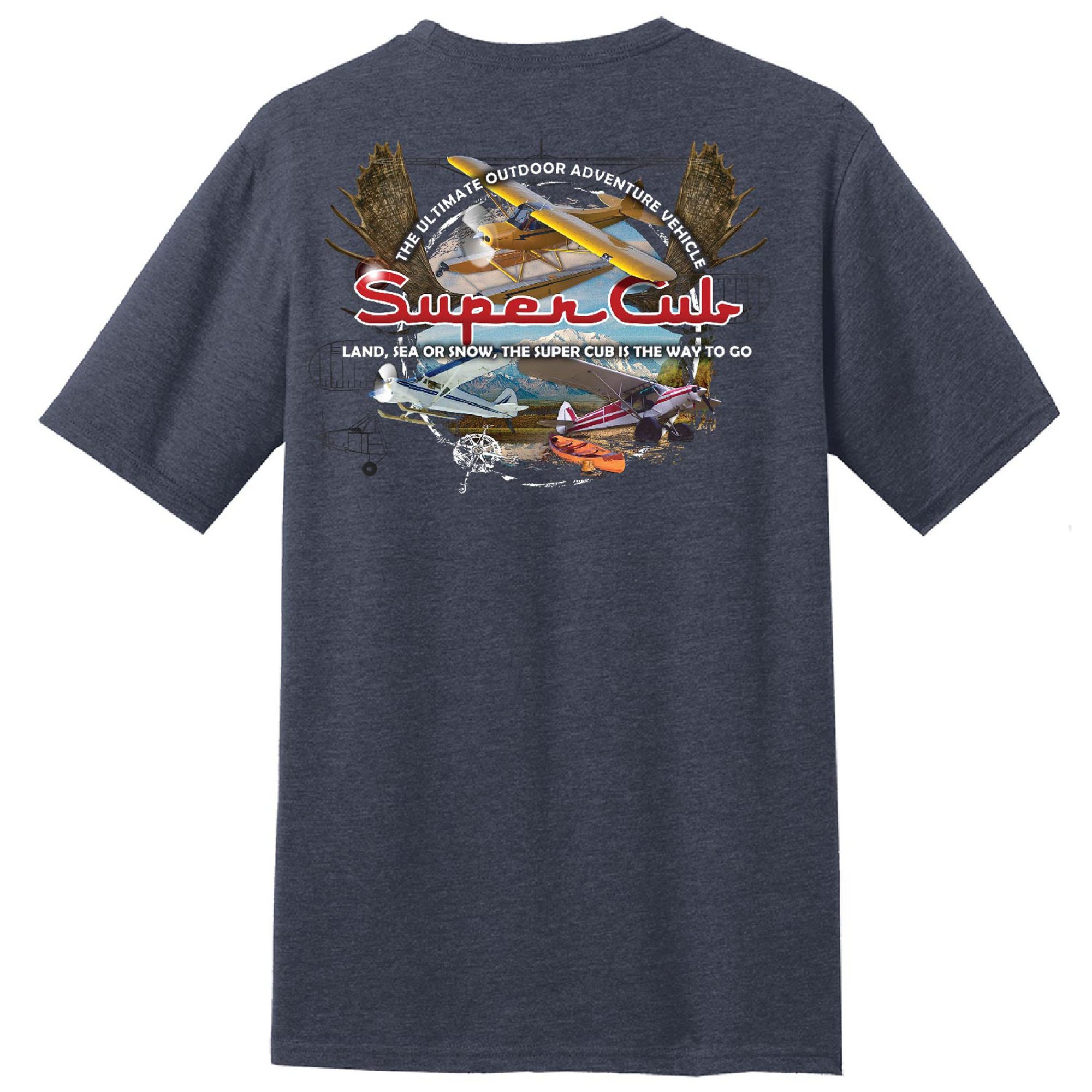 Our Super Cub Moose shirt exemplifies the bush pilot experience, and the plane of choice for a lot of bush pilots. Featuring three distinct configurations and schemes for the cub, you can’t go wrong with this shirt!
