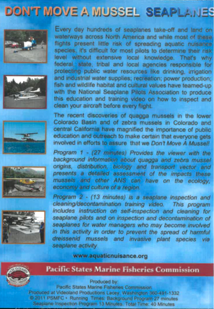 This DVD was produced by the Pacific State Marine Fisheries and the Seaplane Pilots Association to address how pilots can inspect and decontaminate their seaplanes to prevent the spread of invasive species. It is distributed for free to help combat the threat that invasive species represent to the waterways.