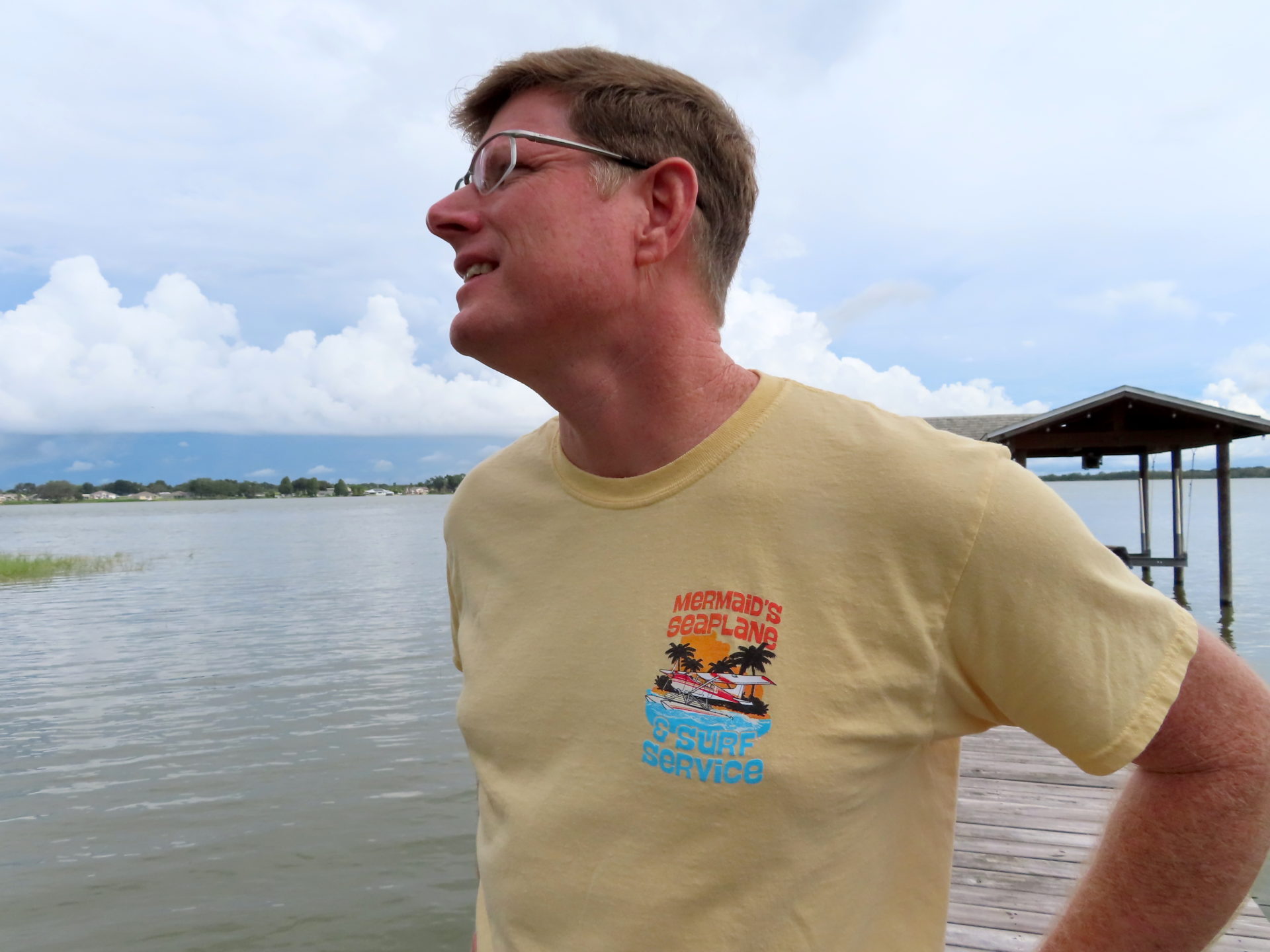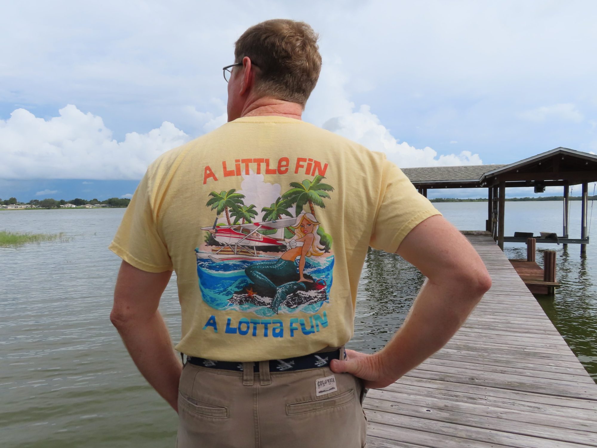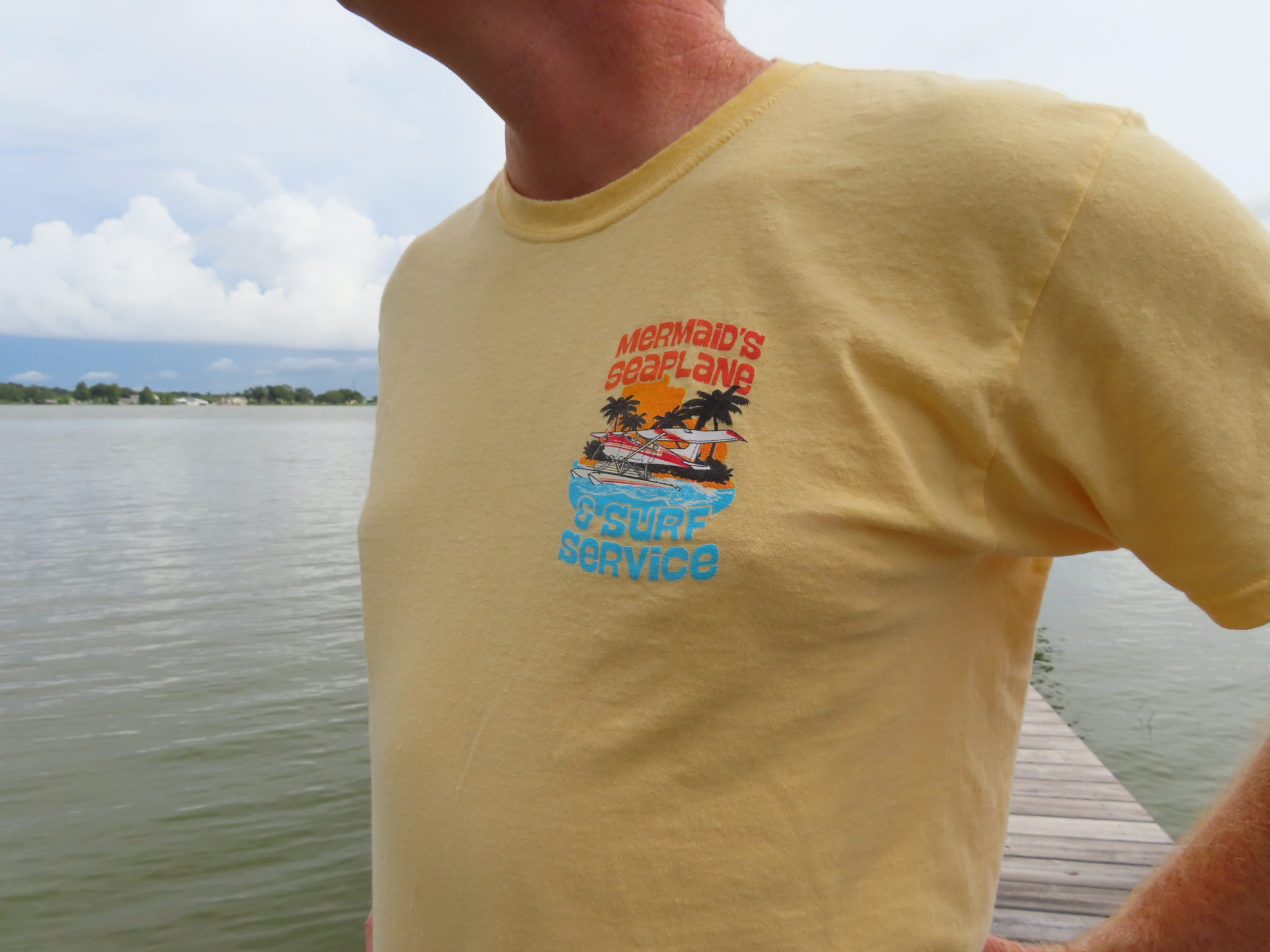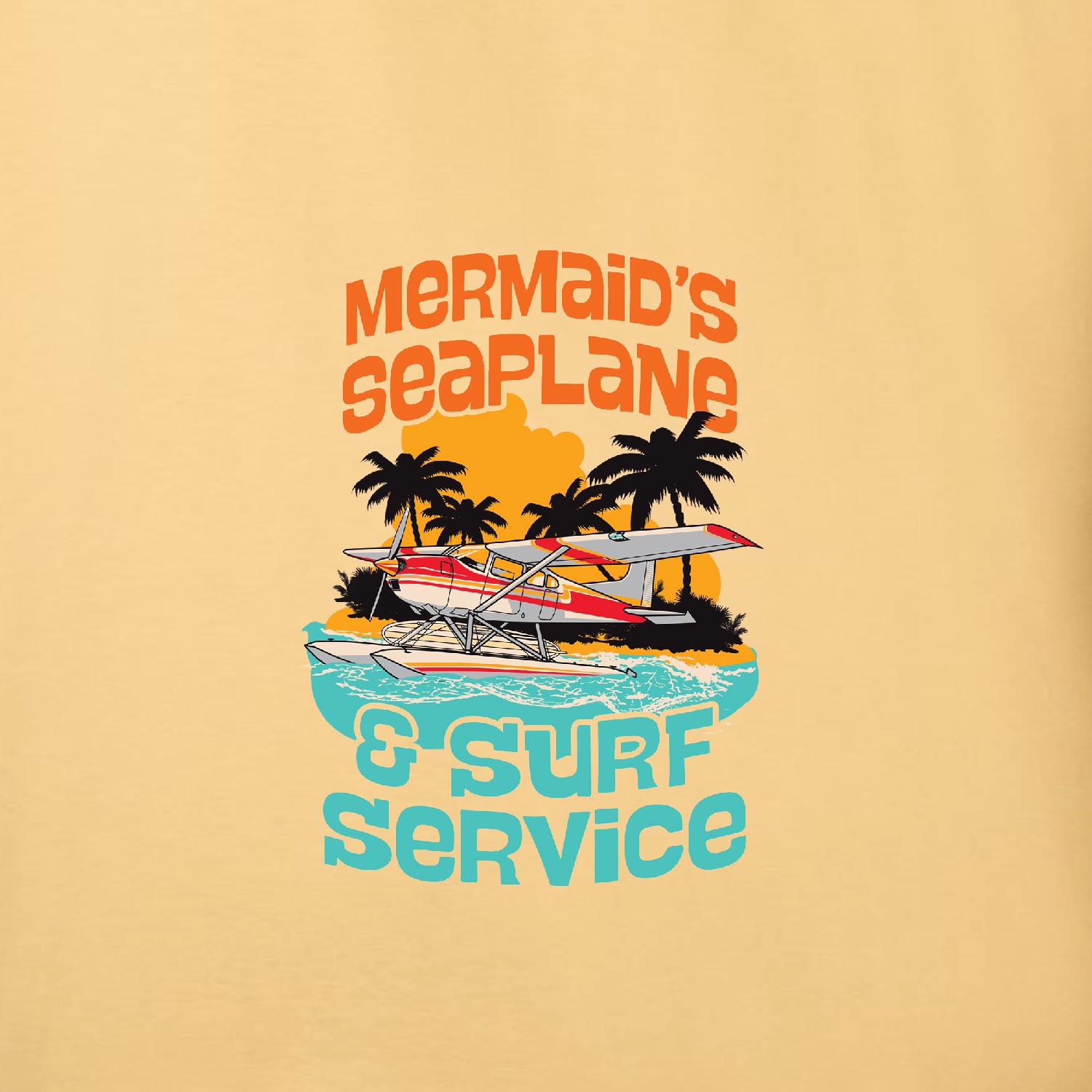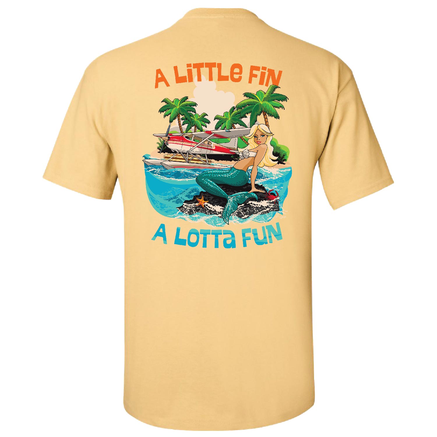 Fun seaplane mermaid surf shirt, “A Little Fin – A Lotta Fun – Mermaids Seaplane & Surf Service”