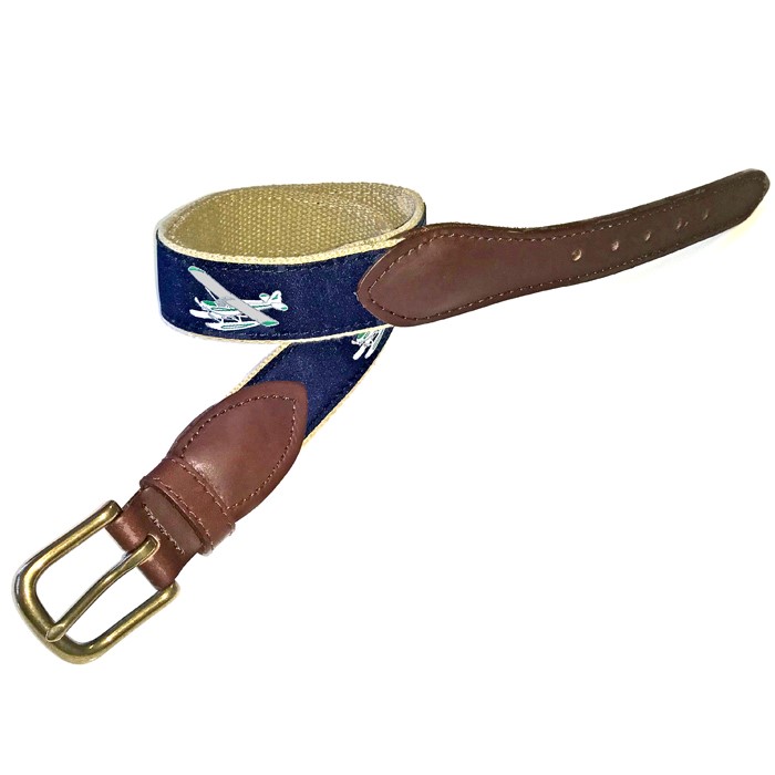A must have accessory for seaplane pilots this belt features a white and green Piper PA-12 floatplane on amphibious floats which appears and is repeated on a navy blue background around the length of this tan weaved belt.